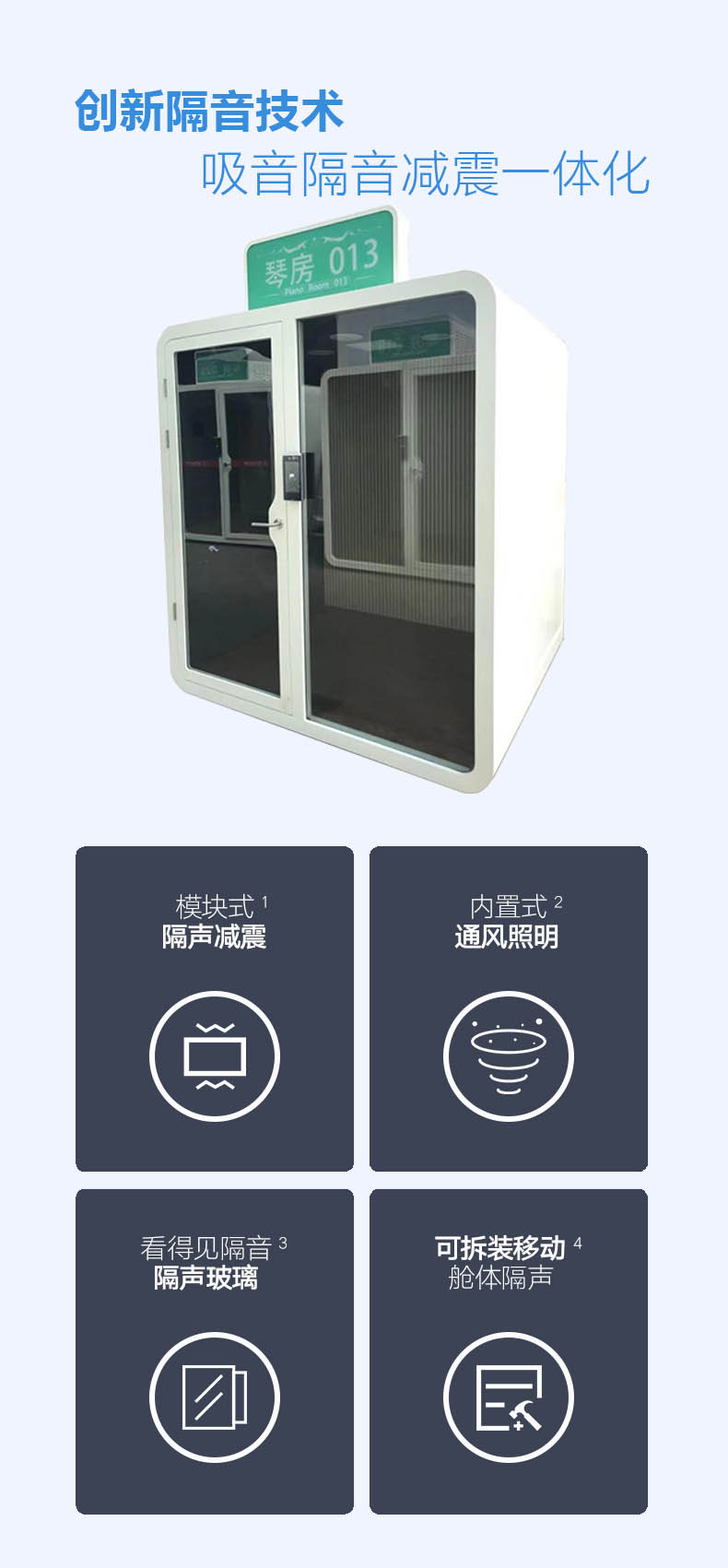 產品特點:可以通過App和小程序為用戶提供定位顯示,線上預約、掃碼開門、倉內燈光、空調、凈化器自動啟動,自動記錄分析用戶的練琴數據并輸出建議指導,用戶按使用時長自助結算,是一款很實用且便捷的自助智慧琴房,浩田自助琴房令充滿科技感.