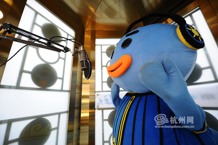 一位市民打扮成一只萌萌的卡通形象,走進(jìn)錄音棚朗讀。
