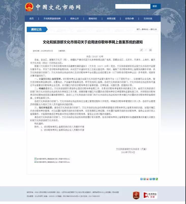 與此同時,也出現(xiàn)了設(shè)備安全難保障、衛(wèi)生環(huán)境較差、歌曲內(nèi)容違規(guī)或者侵權(quán)等問題,針對這些問題,2017年,文化和旅游部發(fā)布了《文化部關(guān)于引導(dǎo)迷你歌詠亭市場健康發(fā)展的通知》,全面規(guī)范了迷你歌詠亭市場,近日,文化和旅游部文化市場司印發(fā)了《關(guān)于啟用迷你歌詠亭網(wǎng)上備案系統(tǒng)的通知》,通知要求各相關(guān)部門全面實行網(wǎng)上備案管理,并明確了權(quán)責(zé)分工,規(guī)范了迷你歌詠亭的日常管理和監(jiān)督檢查工作。此消息一出,一石激起千層浪。
